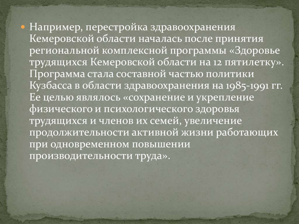 Например, перестройка здравоохраненияКемеровской области началась после принятия