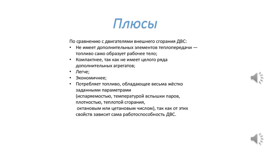 ПлюсыПо сравнению с двигателями внешнего сгорания ДВС: