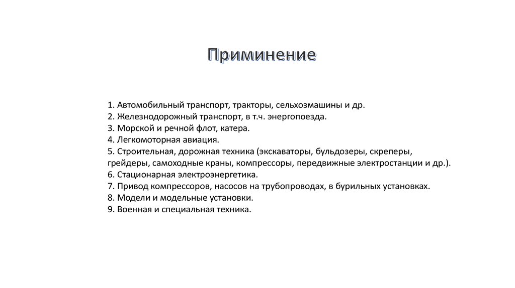 1. Автомобильный транспорт, тракторы, сельхозмашины и др.2. Железнодорожный транспорт, в т.ч. энергопоезда.