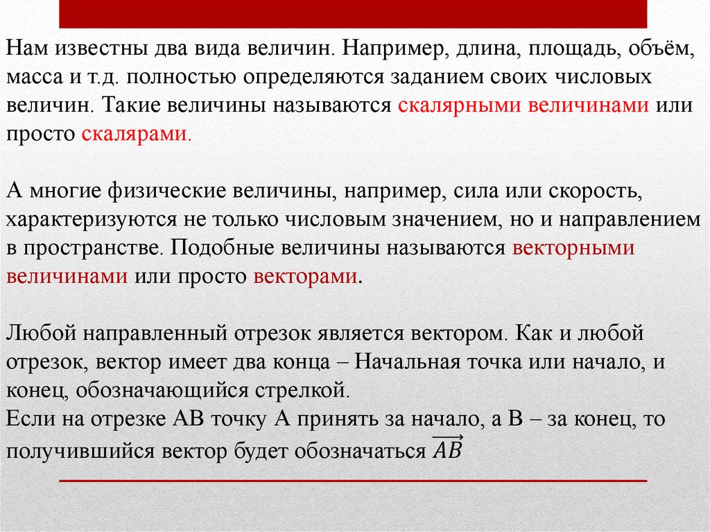 Нам известны два вида величин. Например, длина, площадь, объём,масса и т.д. полностью определяются заданием своих числовых