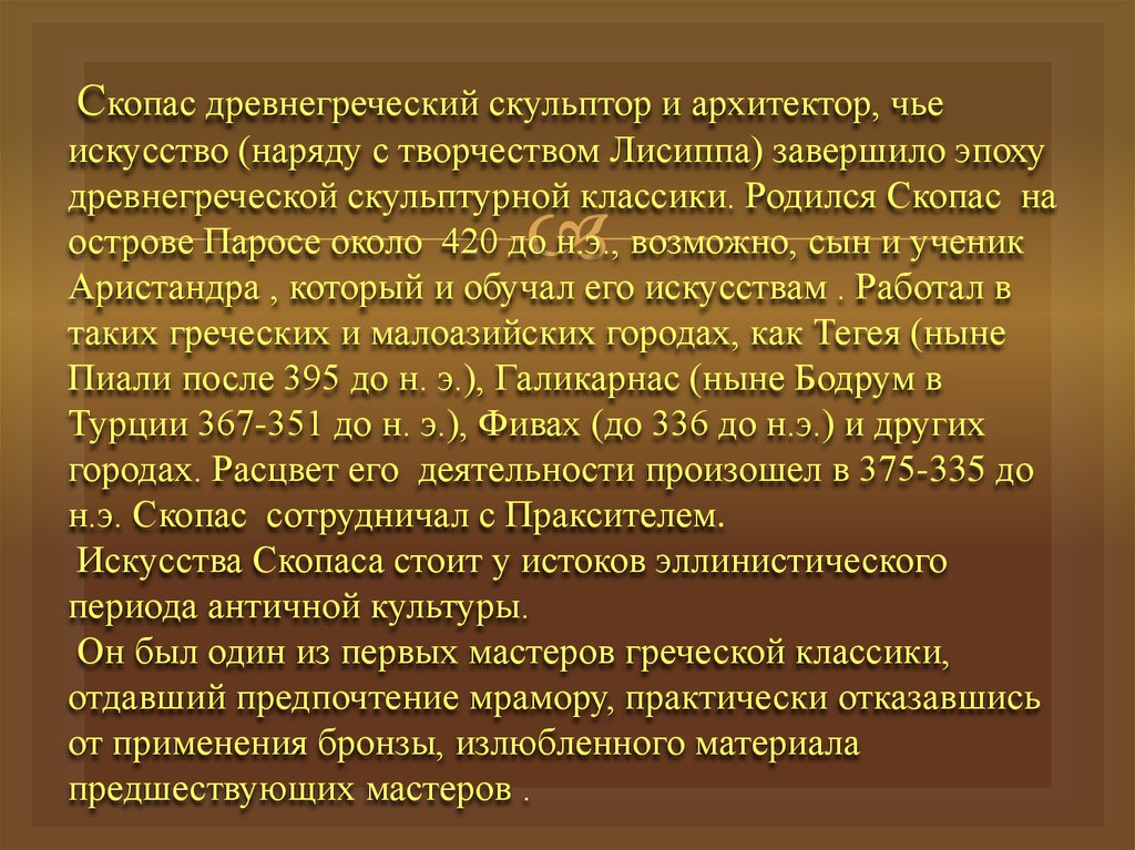 Скопас древнегреческий скульптор и архитектор, чьеискусство (наряду с творчеством Лисиппа) завершило эпоху