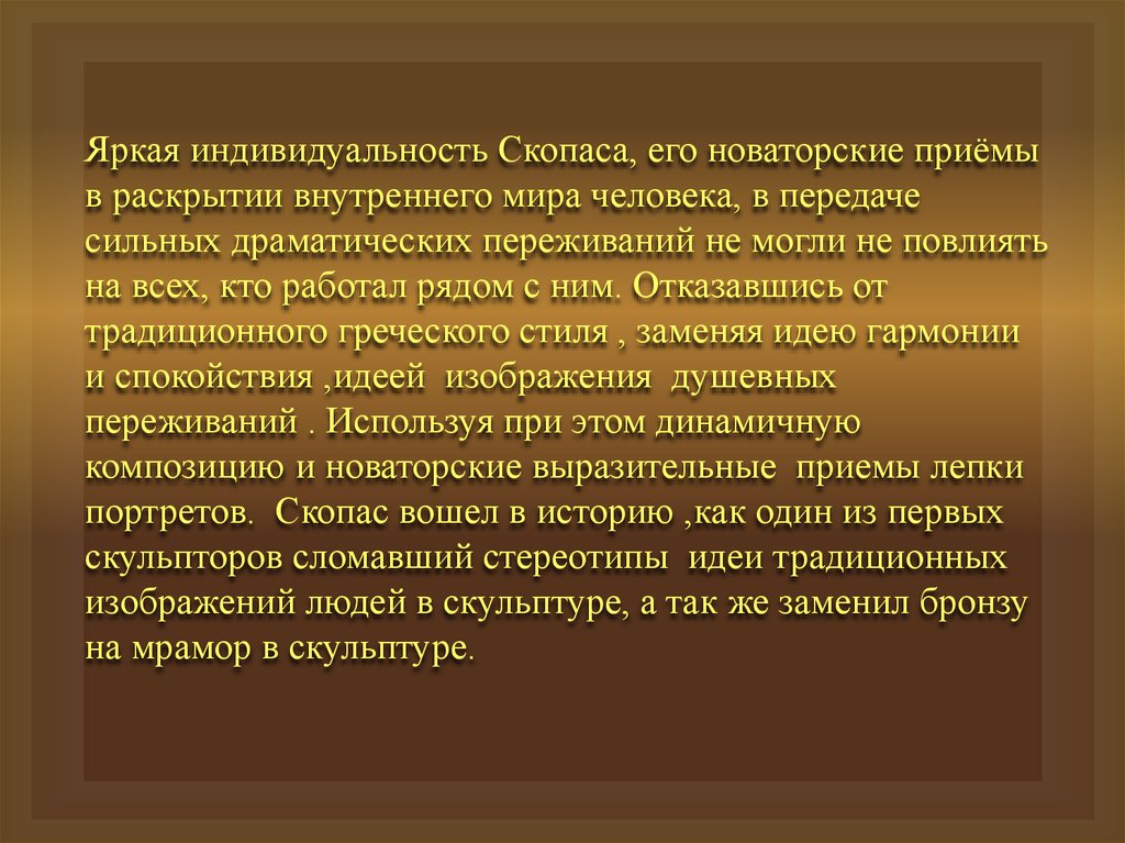 Яркая индивидуальность Скопаса, его новаторские приёмыв раскрытии внутреннего мира человека, в передаче