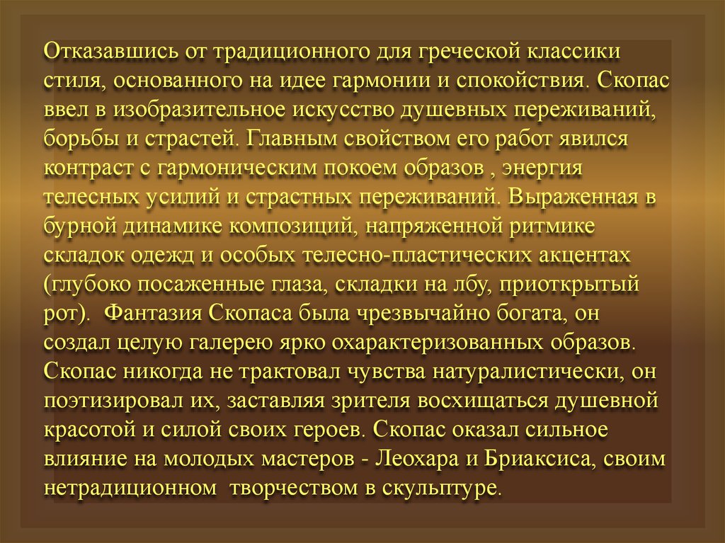 Отказавшись от традиционного для греческой классикистиля, основанного на идее гармонии и спокойствия. Скопас