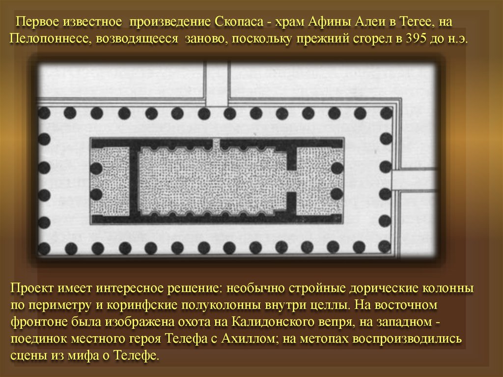Первое известное произведение Скопаса - храм Афины Алеи в Тегее, наПелопоннесе, возводящееся заново, поскольку прежний сгорел в 395 до н.э.