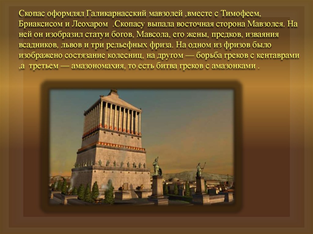 Скопас оформлял Галикарнасский мавзолей ,вместе с Тимофеем,Бриаксисом и Леохаром .Скопасу выпала восточная сторона Мавзолея. На