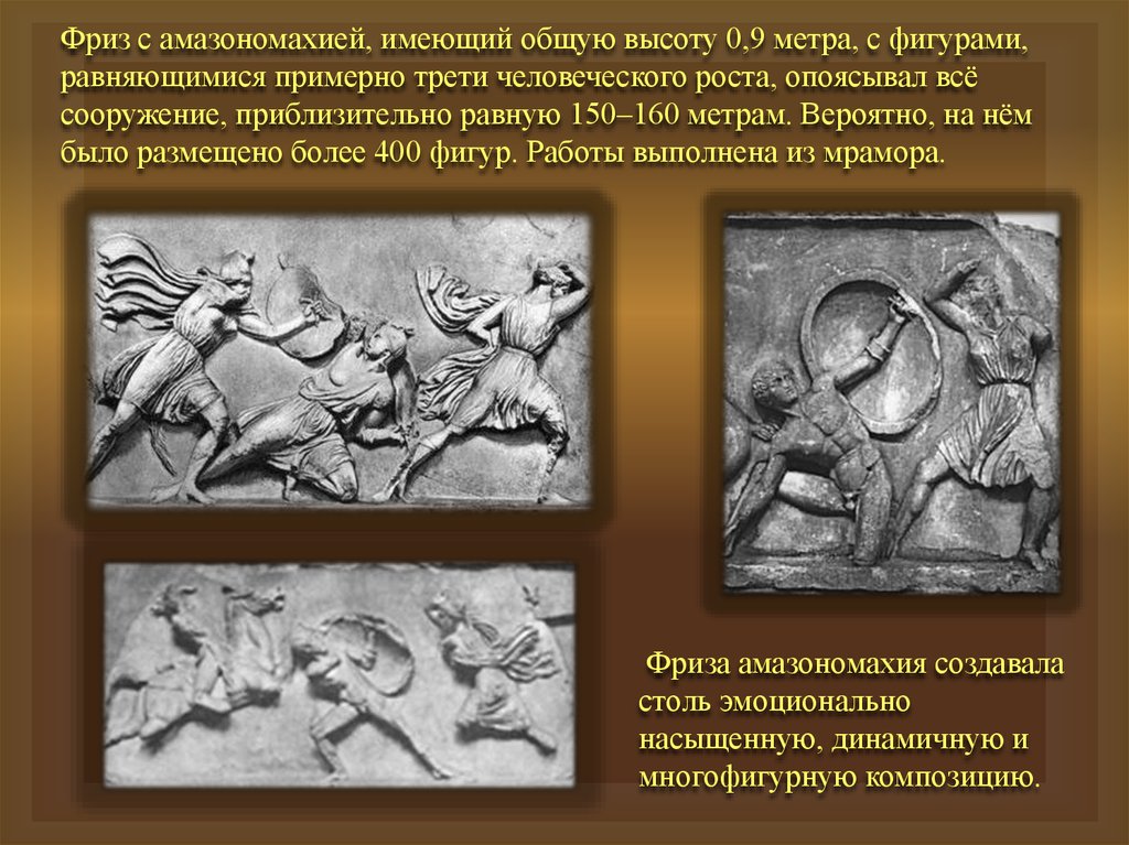 Фриз с амазономахией, имеющий общую высоту 0,9 метра, с фигурами,равняющимися примерно трети человеческого роста, опоясывал всё