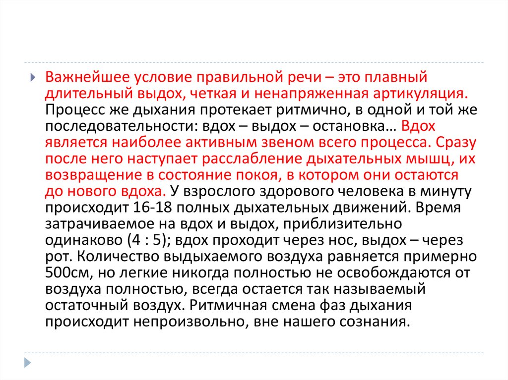 Важнейшее условие правильной речи – это плавныйдлительный выдох, четкая и ненапряженная артикуляция.