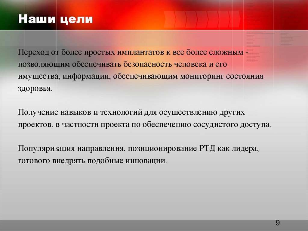 Наши целиПереход от более простых имплантатов к все более сложным позволяющим обеспечивать безопасность человека и его