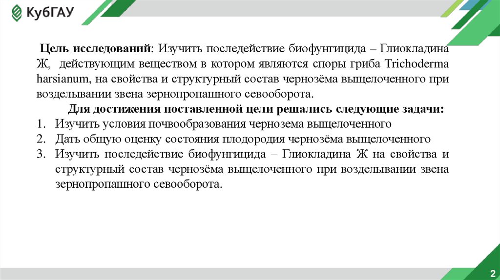 Цель исследований: Изучить последействие биофунгицида – ГлиокладинаЖ, действующим веществом в котором являются споры гриба Trichoderma