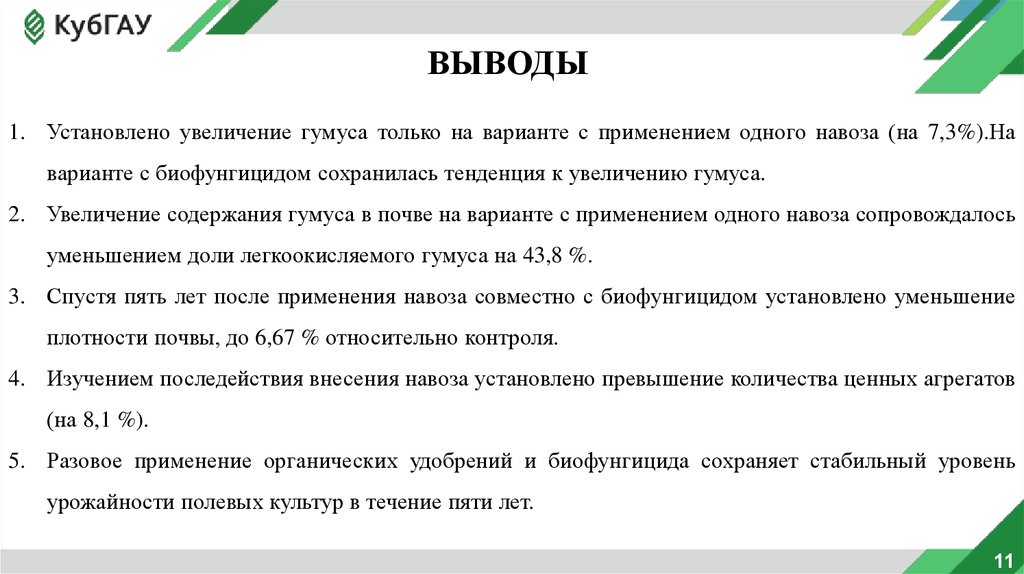 ВЫВОДЫ1. Установлено увеличение гумуса только на варианте с применением одного навоза (на 7,3%).На