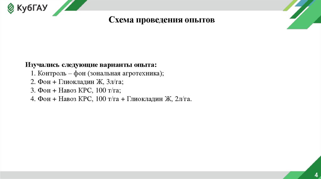 4. Фон + Навоз КРС, 100 т/га + Глиокладин Ж, 2л/га.