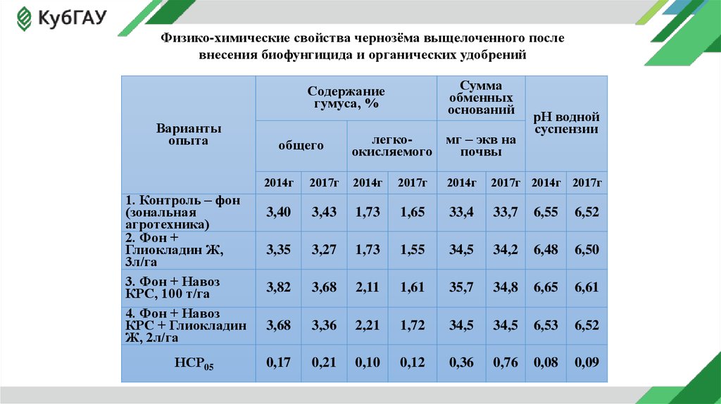 Физико-химические свойства чернозёма выщелоченного послевнесения биофунгицида и органических удобрений