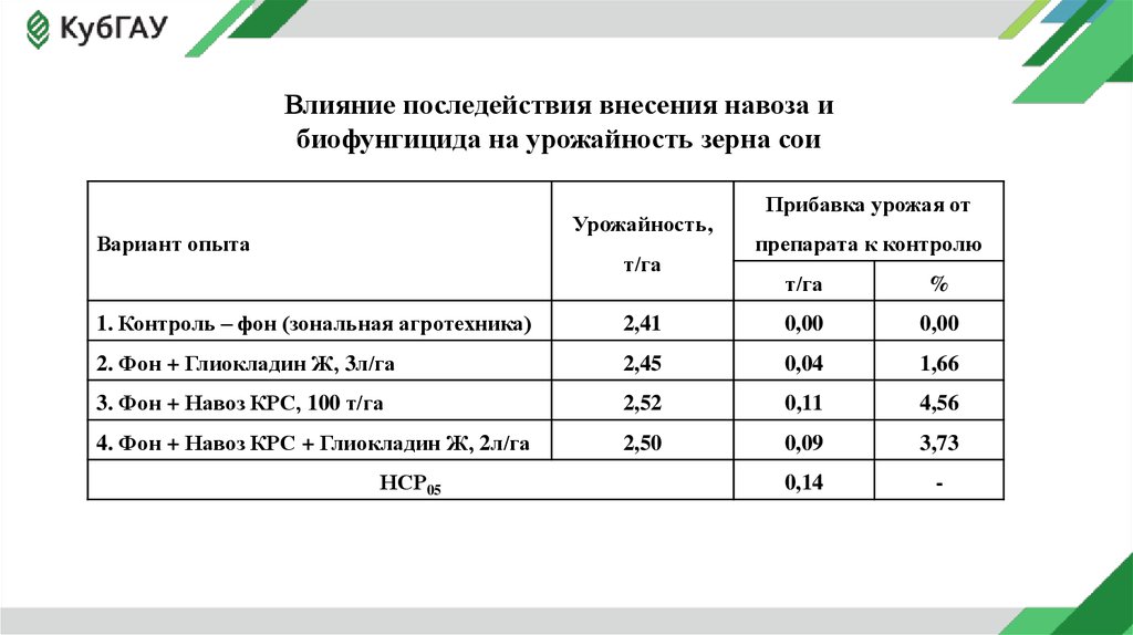 Влияние последействия внесения навоза ибиофунгицида на урожайность зерна сои