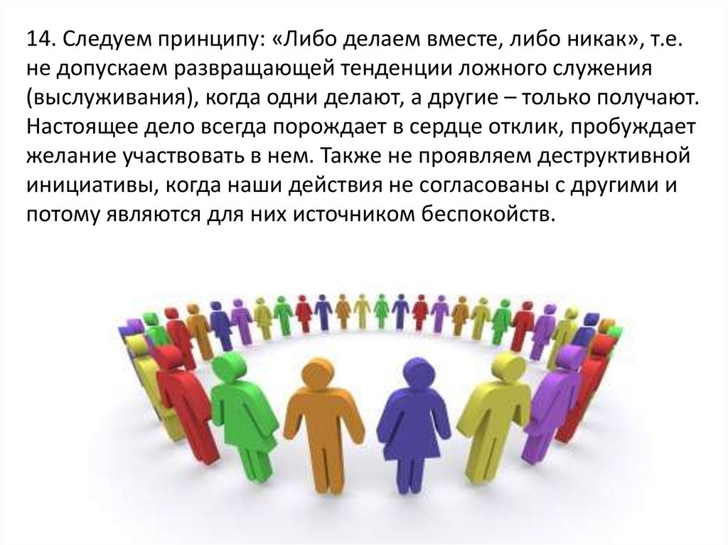 14. Следуем принципу: «Либо делаем вместе, либо никак», т.е.не допускаем развращающей тенденции ложного служения
