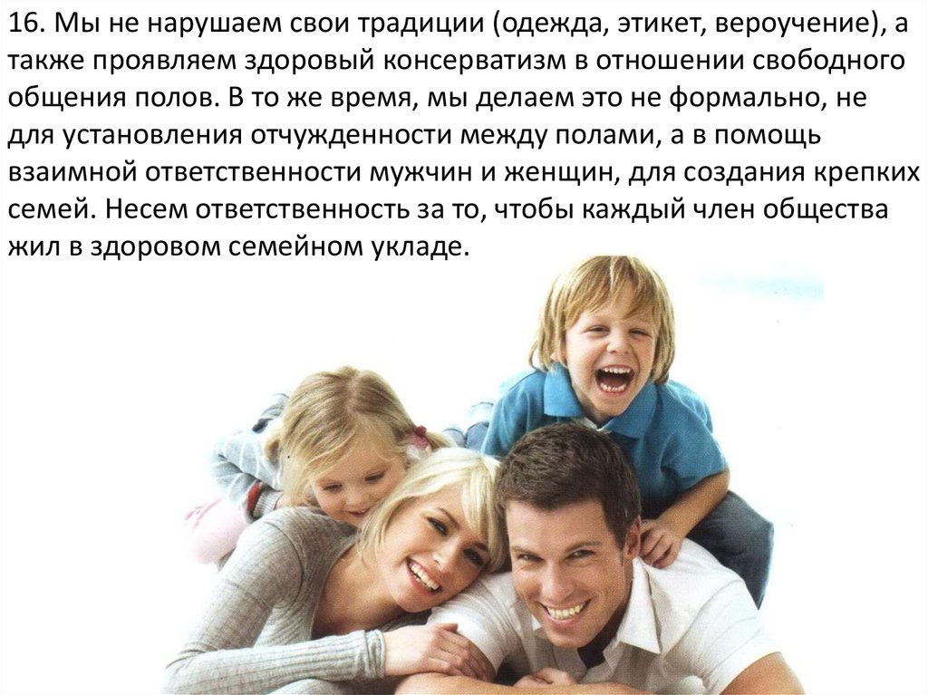16. Мы не нарушаем свои традиции (одежда, этикет, вероучение), атакже проявляем здоровый консерватизм в отношении свободного