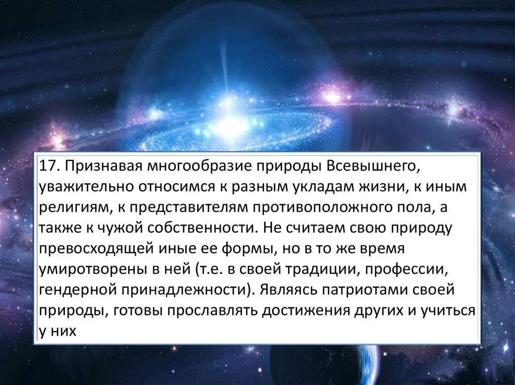 17. Признавая многообразие природы Всевышнего,уважительно относимся к разным укладам жизни, к иным