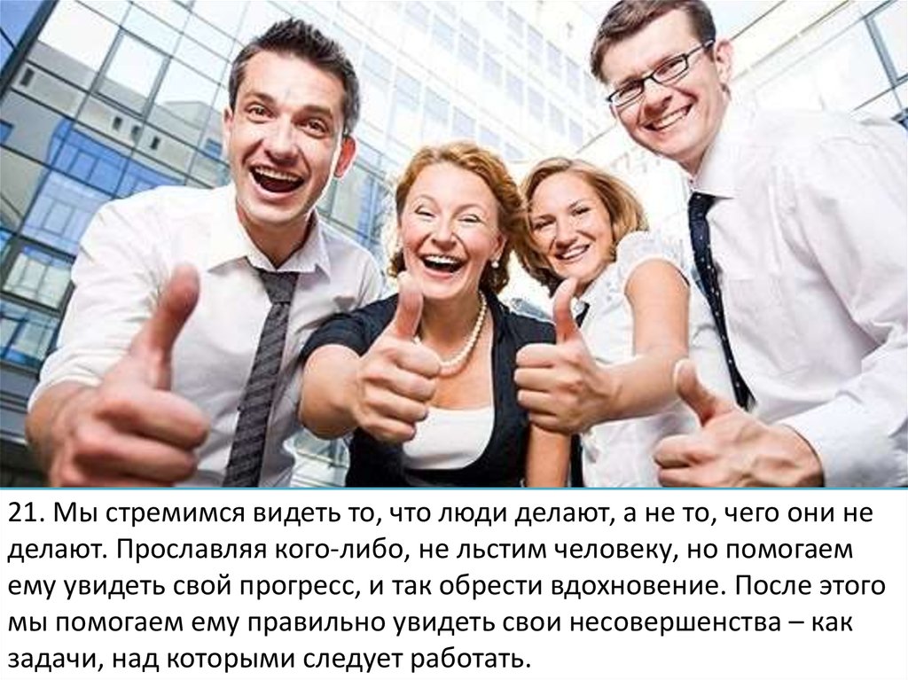 21. Мы стремимся видеть то, что люди делают, а не то, чего они неделают. Прославляя кого-либо, не льстим человеку, но помогаем