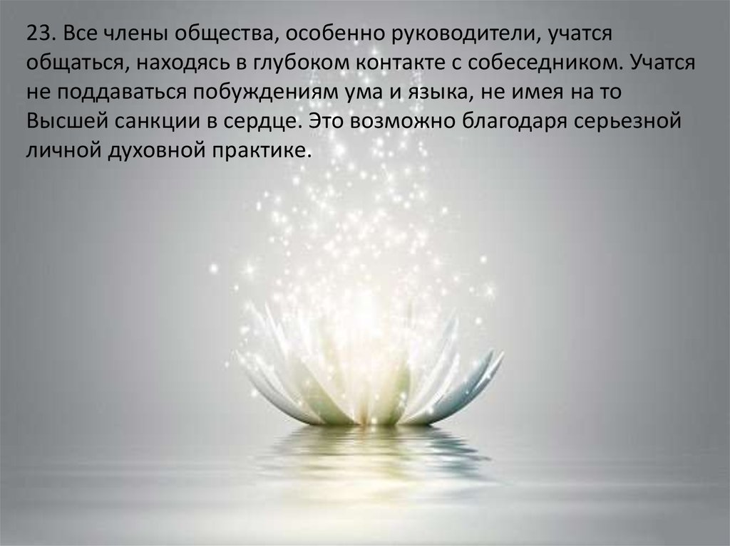 23. Все члены общества, особенно руководители, учатсяобщаться, находясь в глубоком контакте с собеседником. Учатся