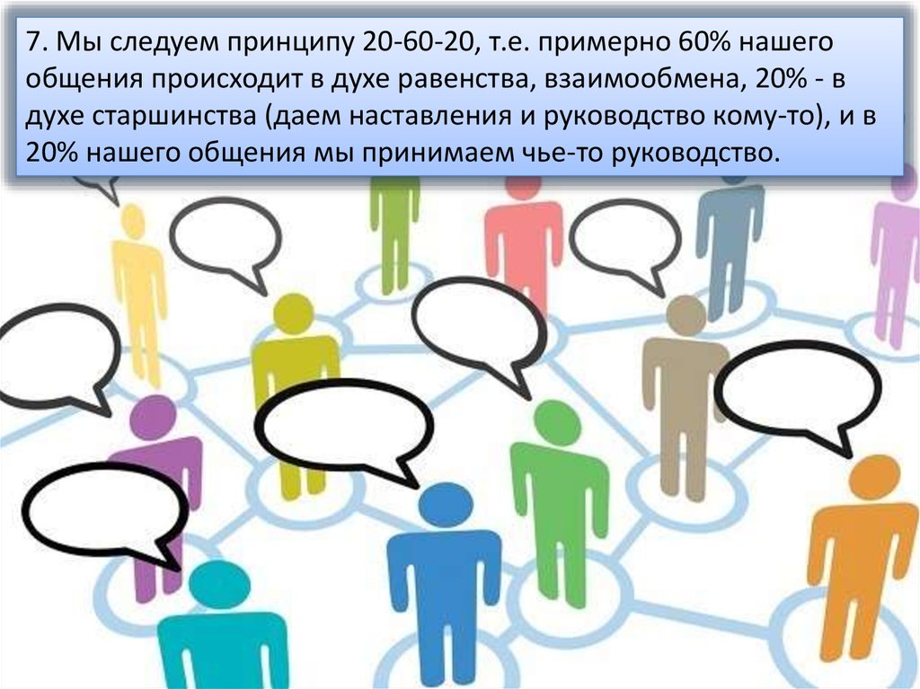 7. Мы следуем принципу 20-60-20, т.е. примерно 60% нашегообщения происходит в духе равенства, взаимообмена, 20% - в