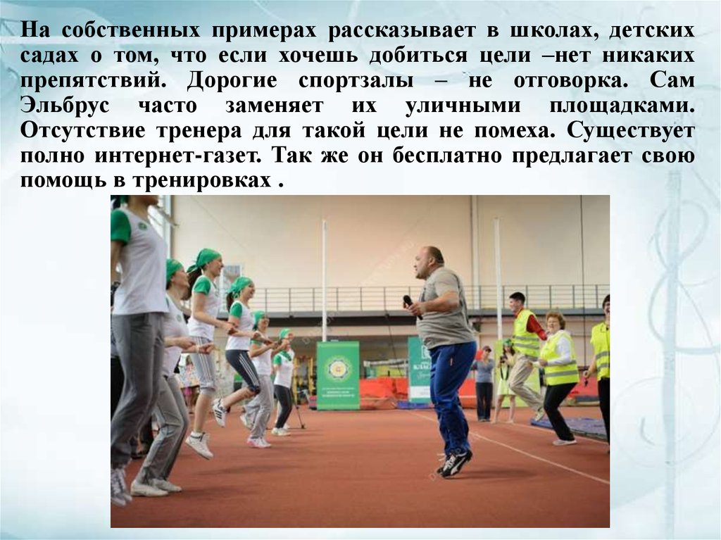 На собственных примерах рассказывает в школах, детскихсадах о том, что если хочешь добиться цели –нет никаких