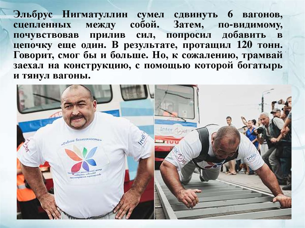 Эльбрус Нигматуллин сумел сдвинуть 6 вагонов,сцепленных между собой. Затем, по-видимому,