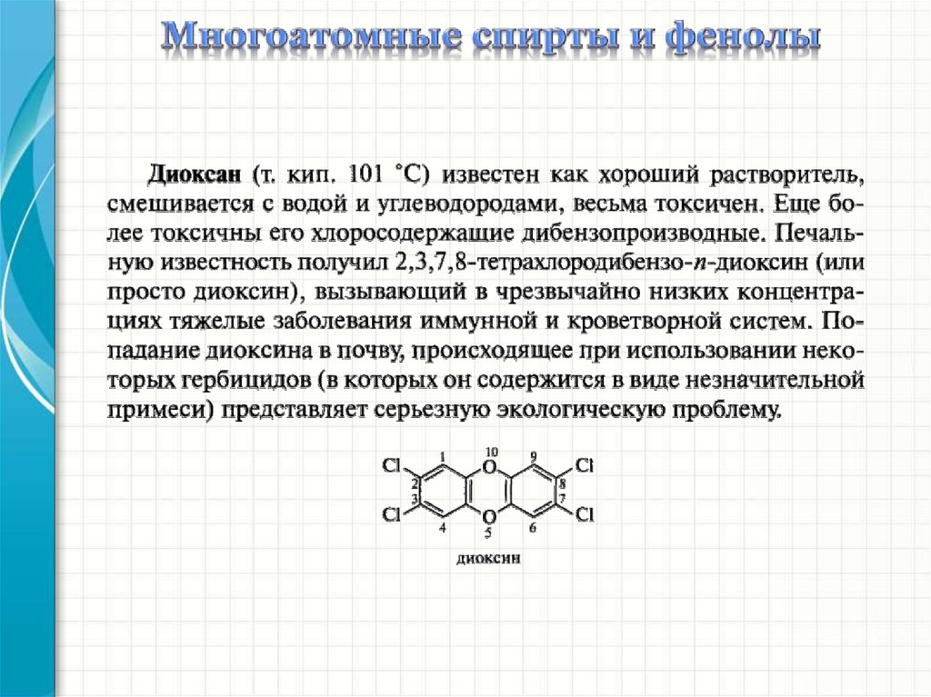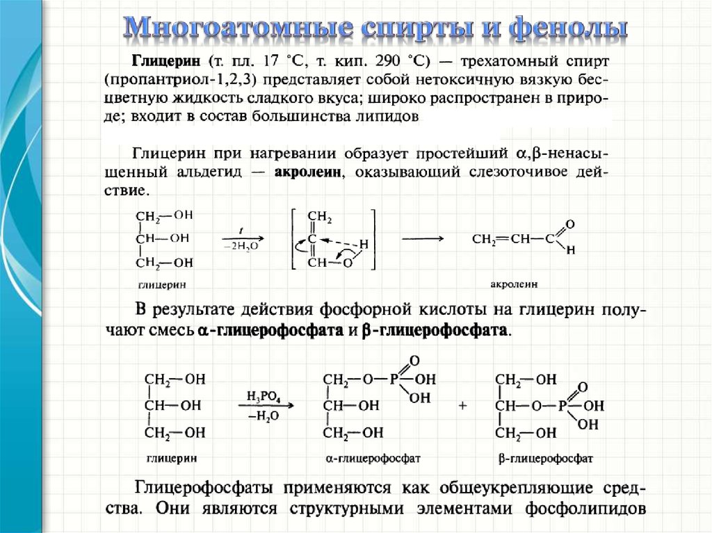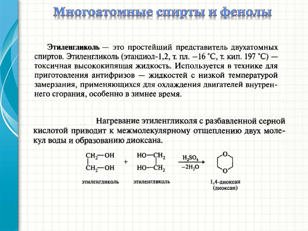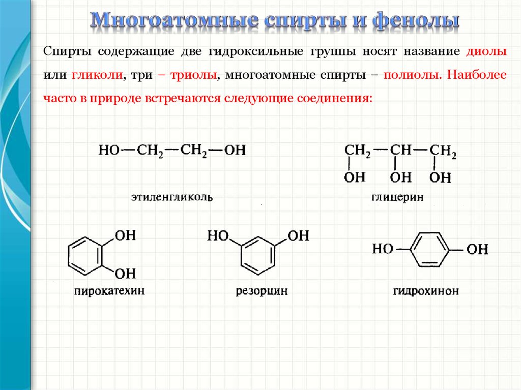Спирты содержащие две гидроксильные группы носят название диолыили гликоли, три – триолы, многоатомные спирты – полиолы. Наиболее