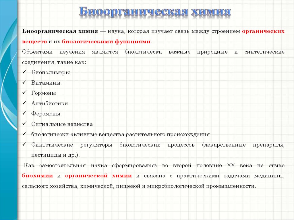 Биоорганическая химия — наука, которая изучает связь между строением органическихвеществ и их биологическими функциями.
