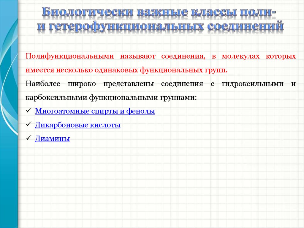 Полифункциональными называют соединения, в молекулах которыхимеется несколько одинаковых функциональных групп.