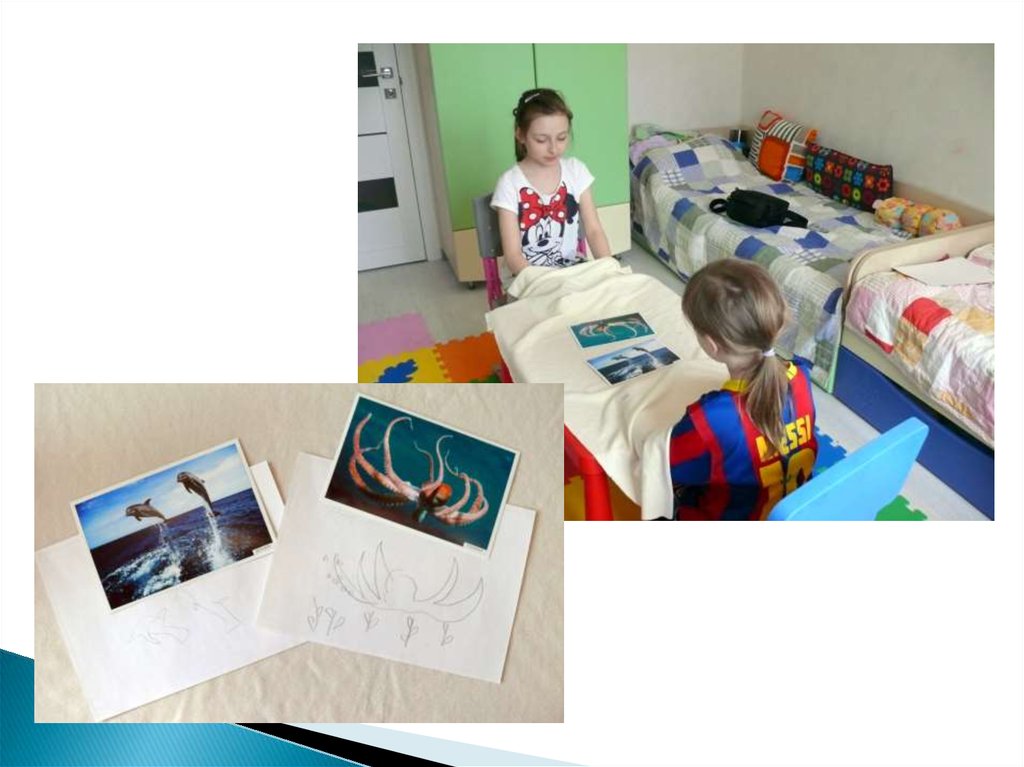 Дайте ребенку в руки карандаш, накройтестол и руки непрозрачной тканью.