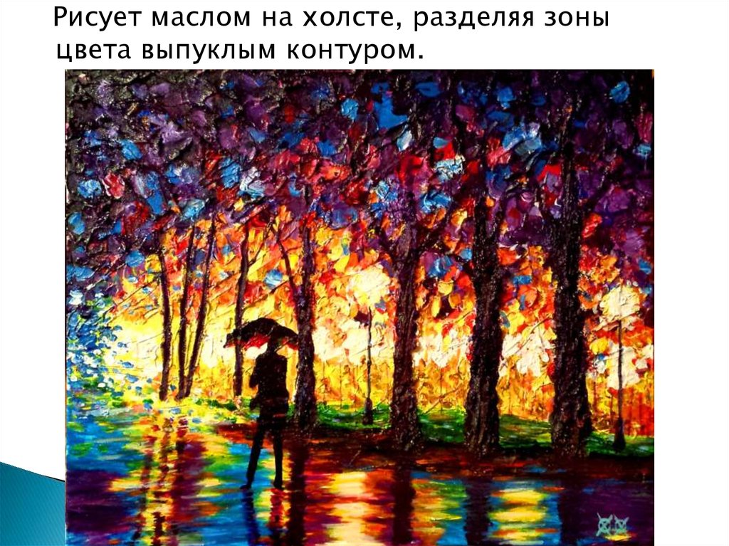 Рисует маслом на холсте, разделяя зоныцвета выпуклым контуром.