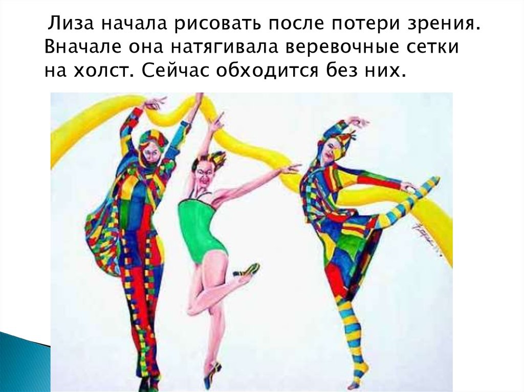 Лиза начала рисовать после потери зрения.Вначале она натягивала веревочные сетки