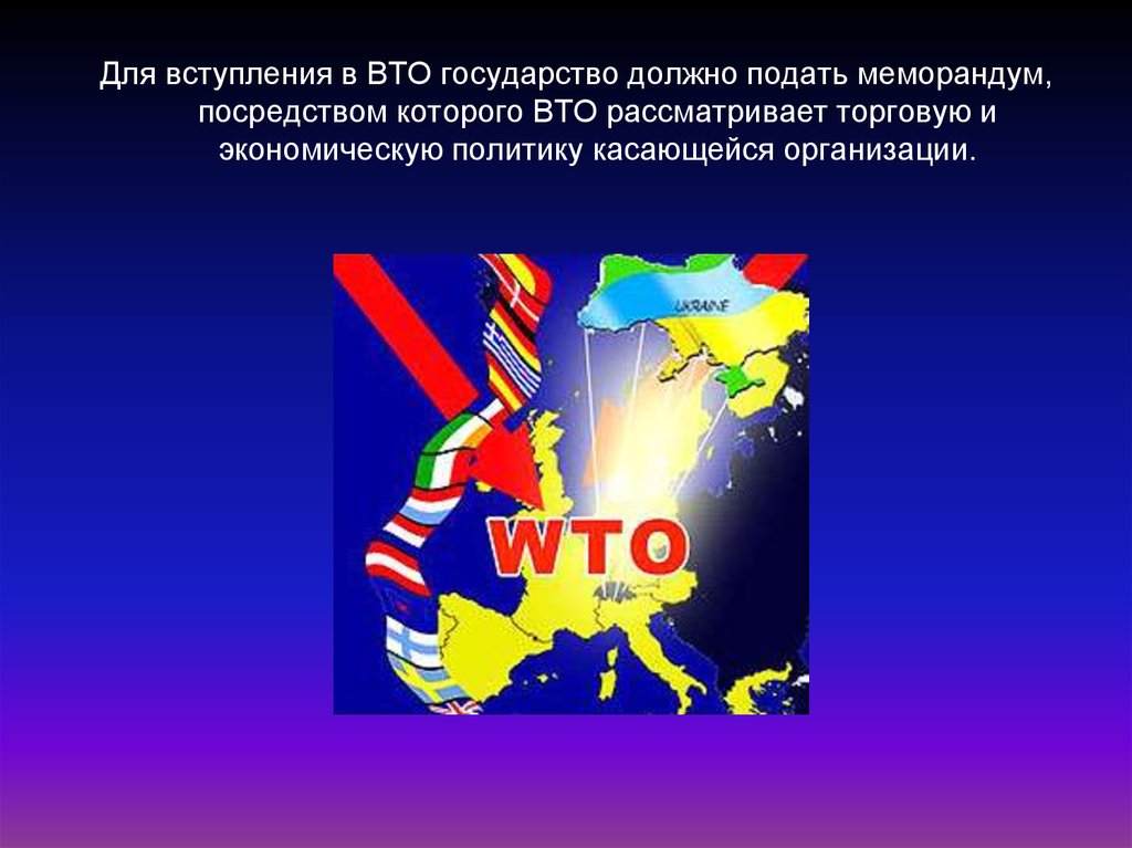 Для вступления в ВТО государство должно подать меморандум,посредством которого ВТО рассматривает торговую и