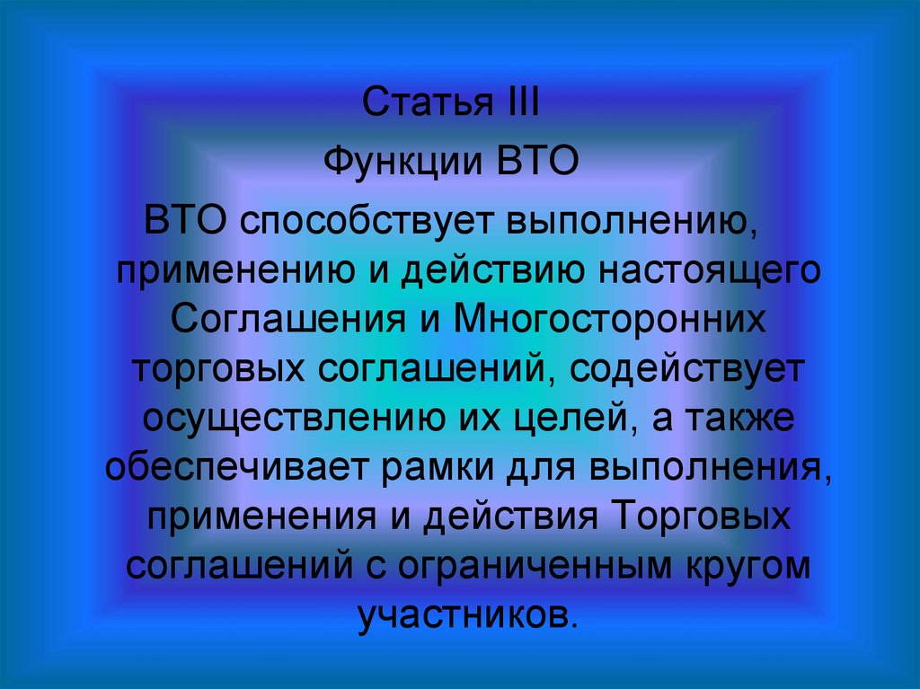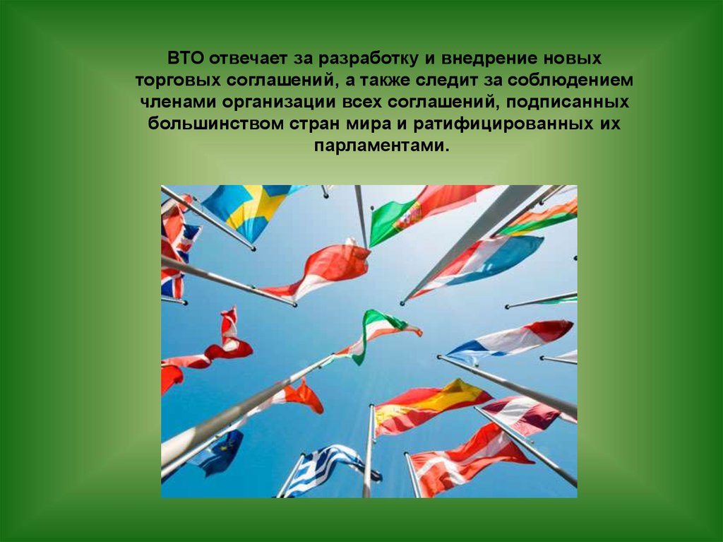 ВТО отвечает за разработку и внедрение новыхторговых соглашений, а также следит за соблюдением