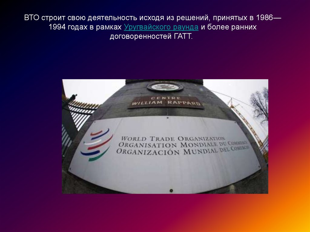 ВТО строит свою деятельность исходя из решений, принятых в 1986—1994 годах в рамках Уругвайского раунда и более ранних