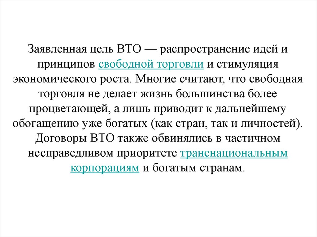 Заявленная цель ВТО — распространение идей ипринципов свободной торговли и стимуляция