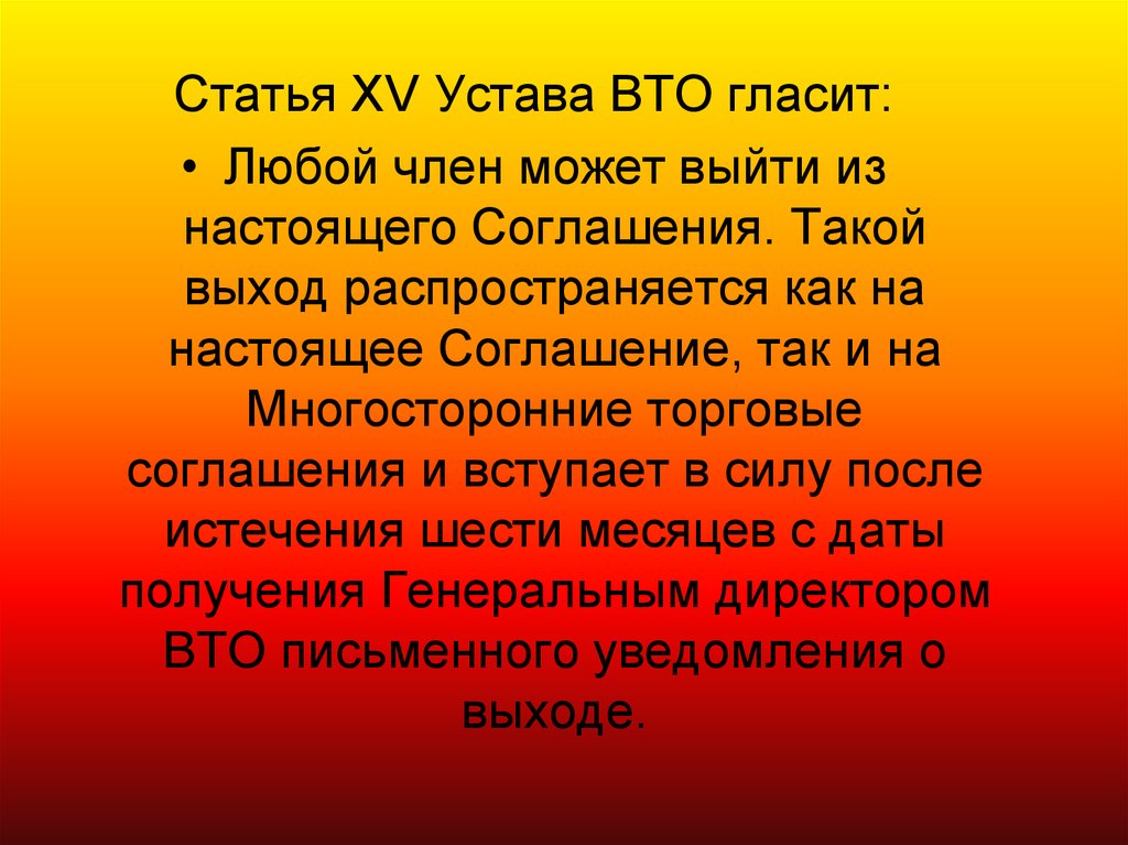 Статья XV Устава ВТО гласит:• Любой член может выйти из
