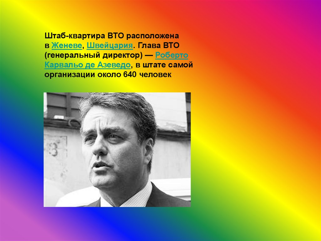 Штаб-квартира ВТО расположенав Женеве, Швейцария. Глава ВТО