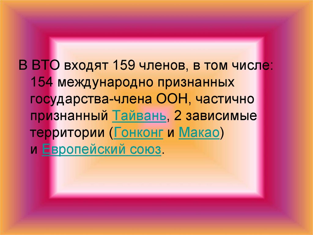 В ВТО входят 159 членов, в том числе:154 международно признанных