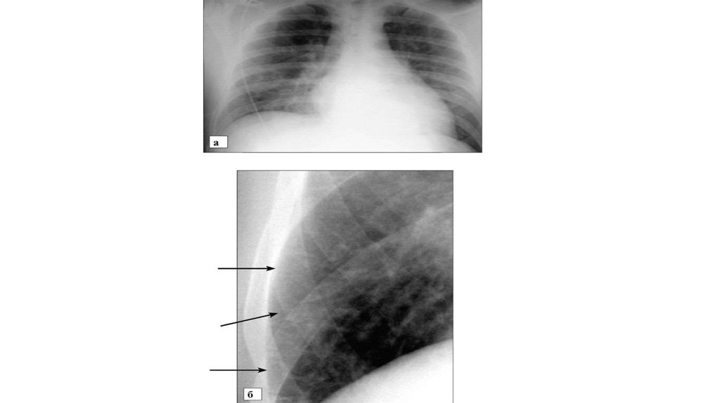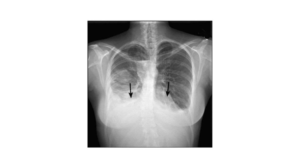 • Рентгенограмма грудной клетки, прямая проекция. Двустороннийплеврит. Видны вогнутые уровни жидкости с двух сторон