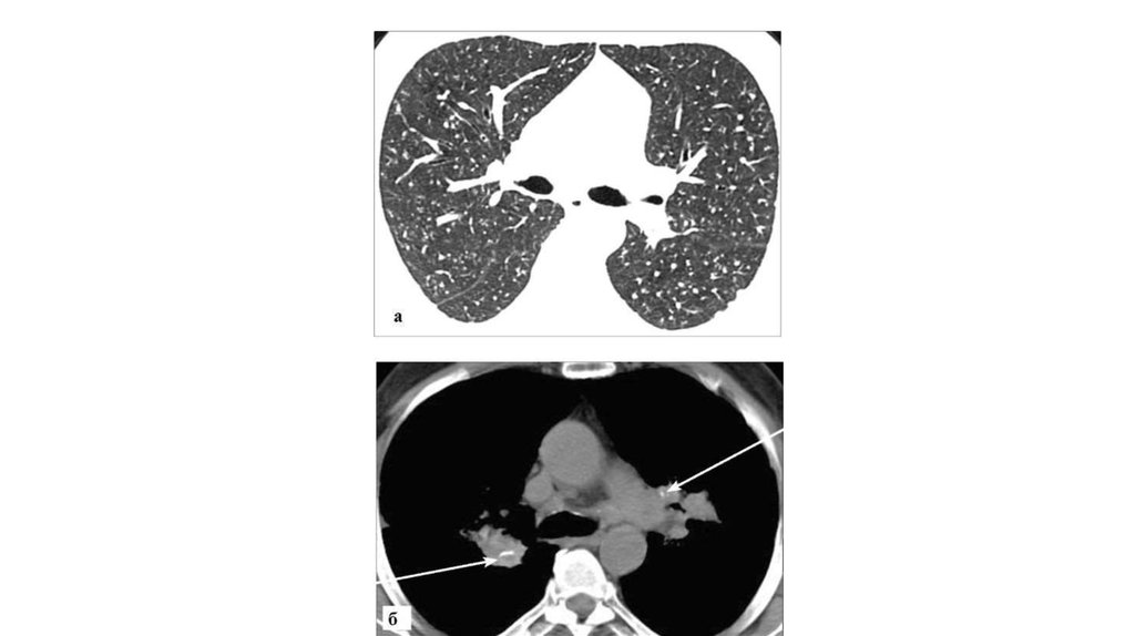 • Силикоз. КТ:• а - режим «легочного окна». В обоих легких определяются