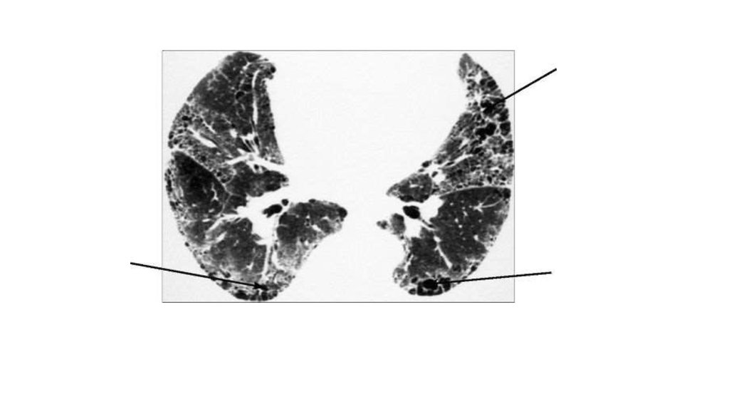• КТ. «Сотовое легкое». В поздней стадии идиопатическоголегочного фиброза образовались обширные области деструкции
