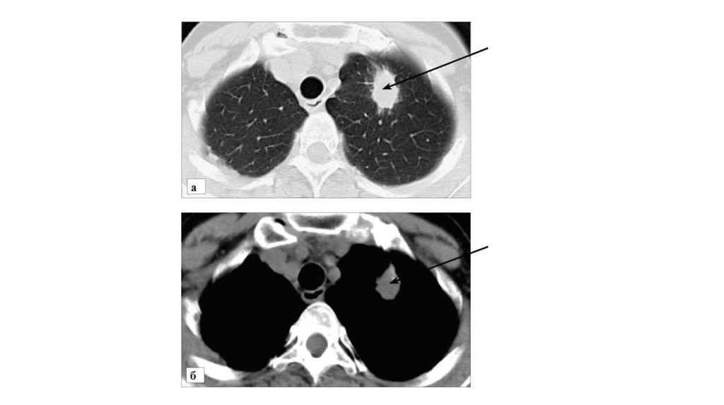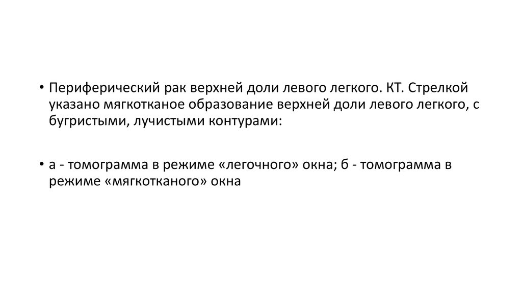 • Периферический рак верхней доли левого легкого. КТ. Стрелкойуказано мягкотканое образование верхней доли левого легкого, с