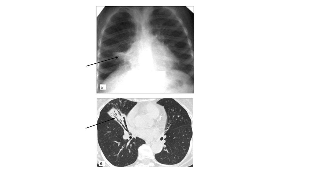 содержащие воздух бронхи: а - рентгенограмма в прямой