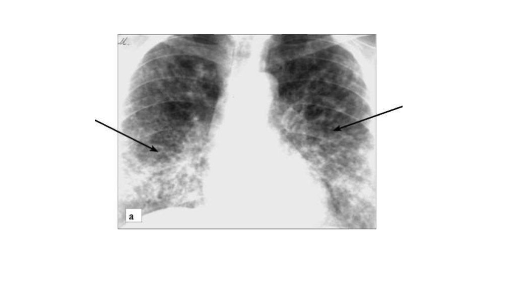 • Идиопатический легочный фиброз:а - рентгенограмма в прямой проекции. Двустороннее усиление и