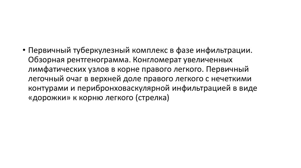 • Первичный туберкулезный комплекс в фазе инфильтрации.Обзорная рентгенограмма. Конгломерат увеличенных