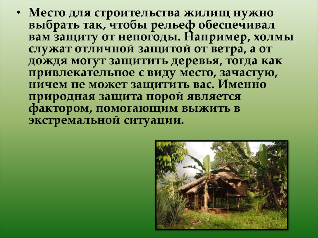• Место для строительства жилищ нужновыбрать так, чтобы рельеф обеспечивал