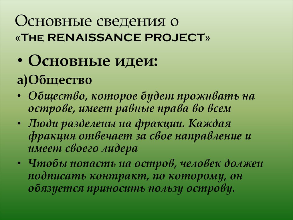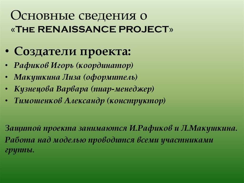 3. Основные сведения о «The RENAISSANCE PROJECT»