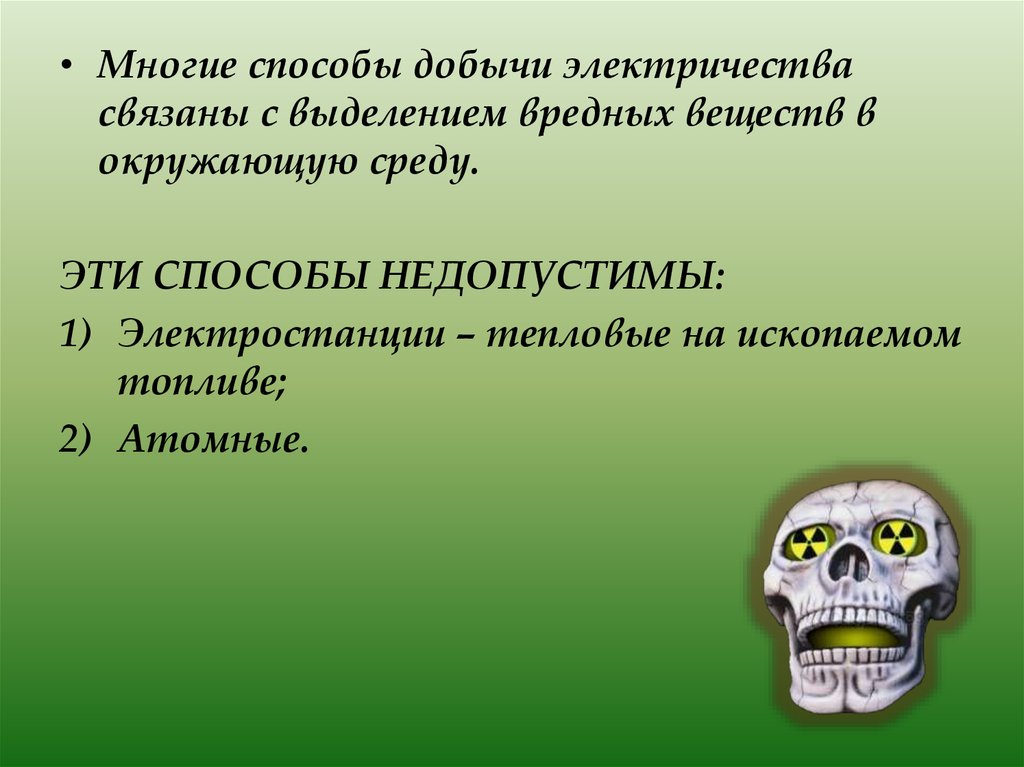 • Многие способы добычи электричествасвязаны с выделением вредных веществ в