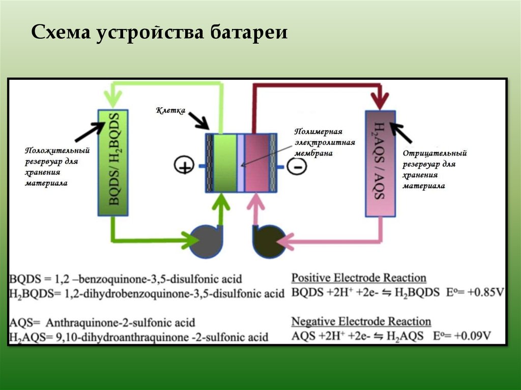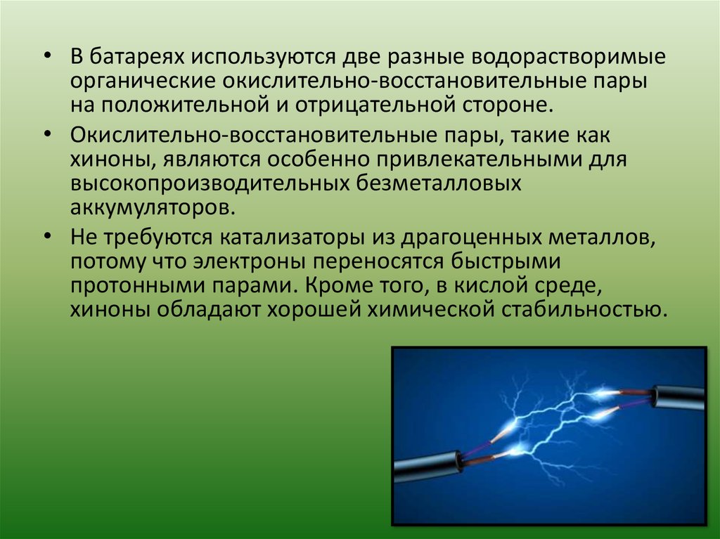 • В батареях используются две разные водорастворимыеорганические окислительно-восстановительные пары