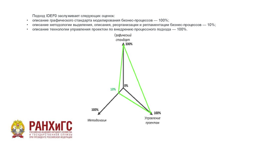 Подход ARIS заслуживает следующих оценок:описание графического стандарта моделирования бизнес-процессов — 100%;